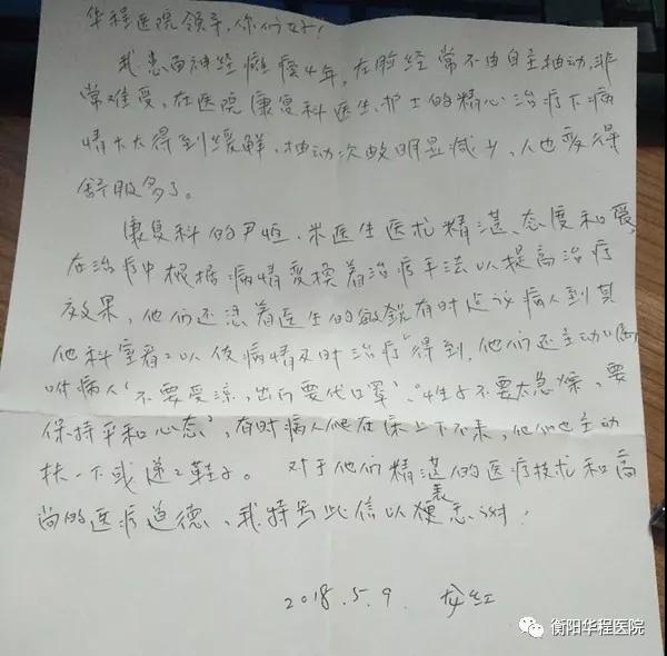 5月10日康復(fù)中心收到面神經(jīng)癱瘓4年患者龍紅的感謝信,患者以平實的文字對病情好轉(zhuǎn)進行了講述,為此還特意對科室醫(yī)生尹恒和米醫(yī)生提出了表揚。