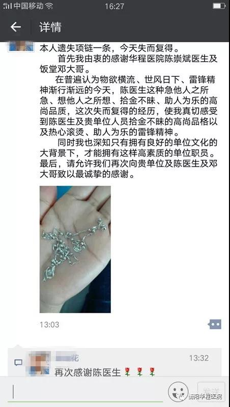 病人來門診看病時,不心時遺失了一條項鏈被內(nèi)科門診專家陳崇斌拾到并交還給了失主本人,原本這樣的事情在衡陽華程醫(yī)院是很平常,沒想到該病人在朋友圈對此寫了一長篇感嘆,我們的醫(yī)護人員看到后也是滿滿的正能量......