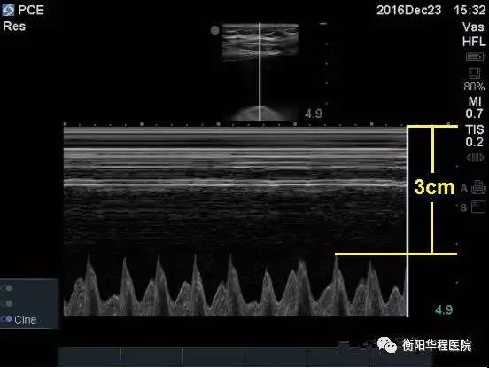 圖2 第5肋間M超可見舒張期心臟到胸壁皮膚距離約為3cm