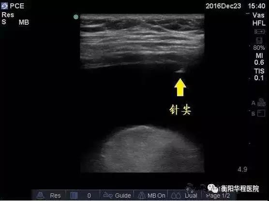 圖3 采用平面內(nèi)超聲引導(dǎo)技術(shù)可實(shí)時(shí)觀察到針尖位置