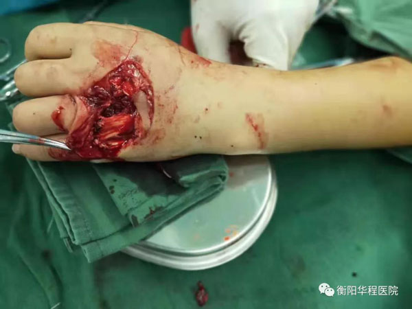 18:50,救護車到達醫(yī)院,醫(yī)護人員兵分多路開展救治,一組為患者完善各種身體檢查,并通過輸血、補液等一系列措施維持患者生命體征,另一組則對傷口進行清創(chuàng),把壞死的肌肉組織等全部清理干凈,為接下來的手術(shù)做好準(zhǔn)備。
